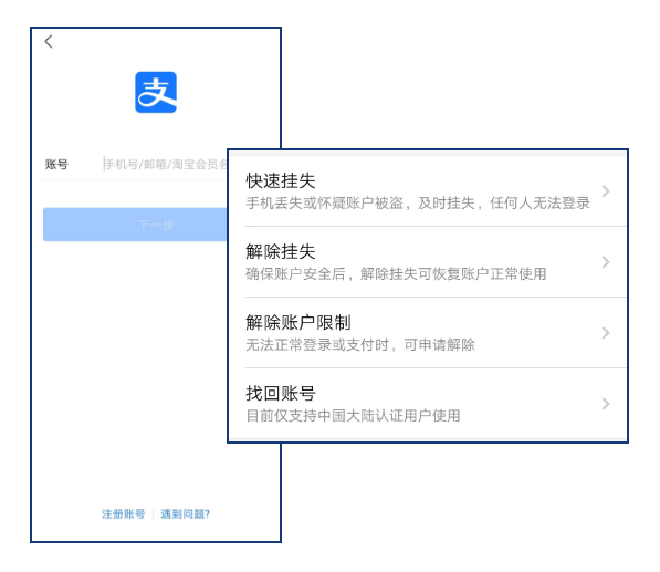 使用他人手机在支付宝APP上挂失,在支付宝的登陆页面上,点开下方的“遇到问题”,点击“快速挂失”完成操作。