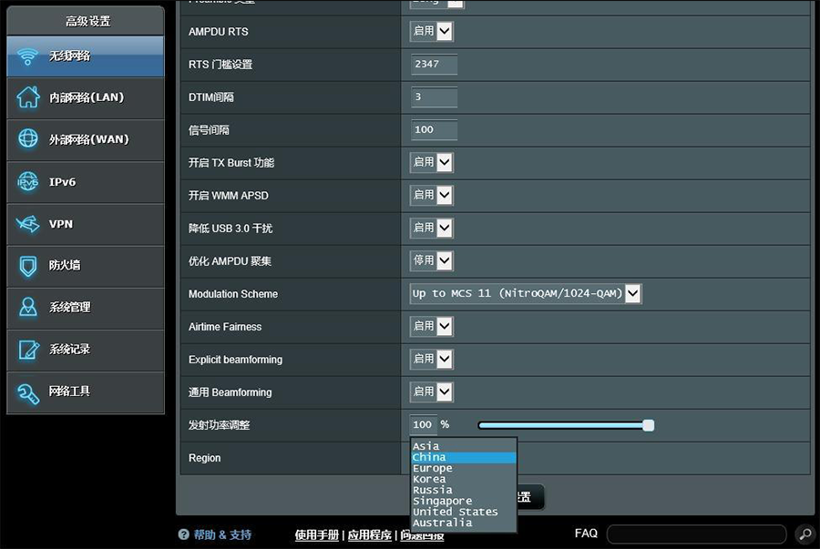还有一些具有骚操作的路由器,像华硕的 AC86U,路由器管理界面里,找到 WiFi 选区,将区域设置为澳大利亚,无线信号的强度还能再提升一个等级,手里的 AC86U 试了一下,还真的可以。